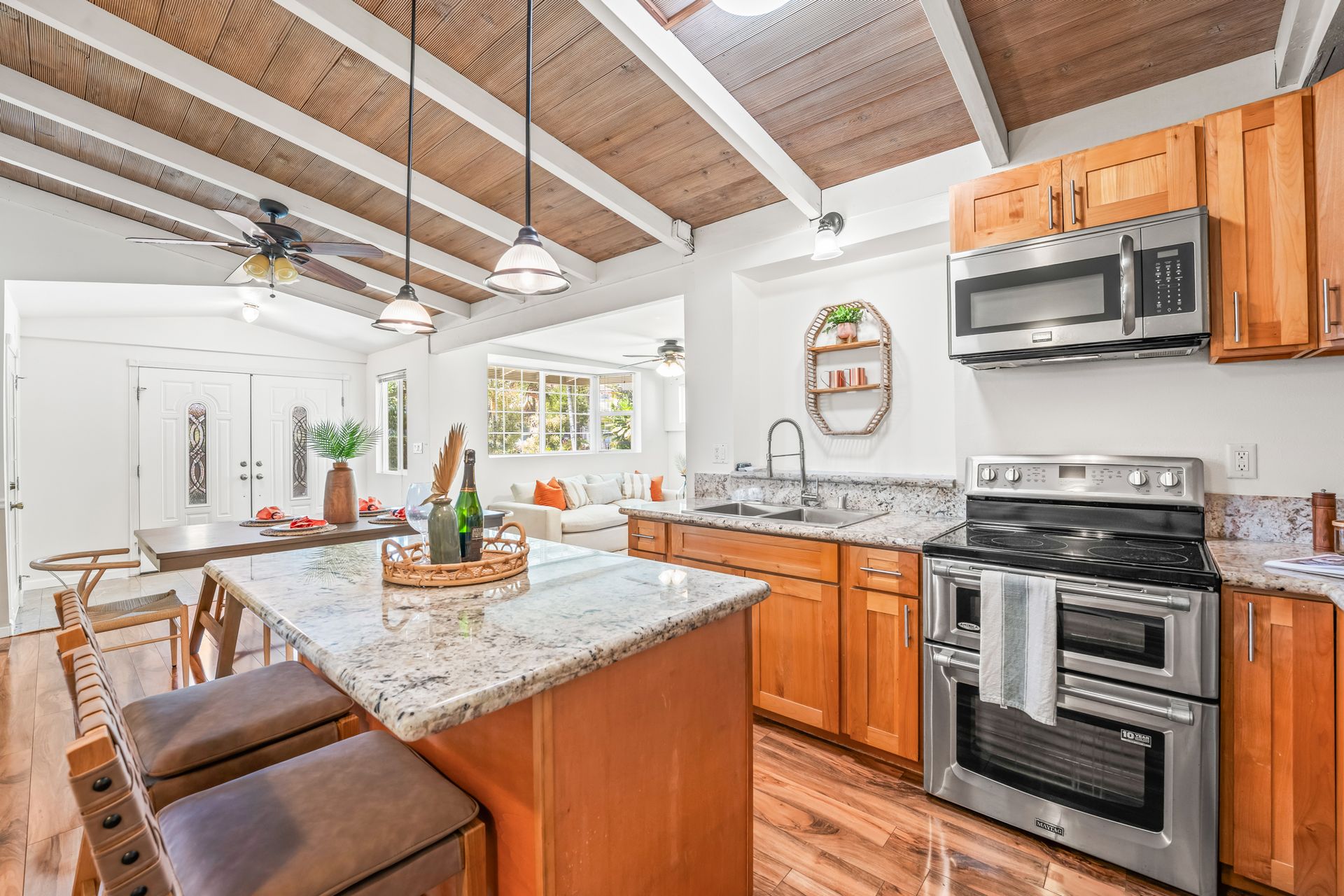 Welcome to this rare one-level gem in Kapahulu, offering the perfect blend of comfort and convenience. This beautifully maintained 4-bedroom, 3.5-bathroom home features a spacious layout with no stairs, ensuring easy single-level living. Enjoy vaulted ceilings in the dining and kitchen areas, newer double-pane windows throughout, and split AC in every room for year-round comfort. The primary bathroom has been fully renovated, and the kitchen is equipped with stainless steel appliances, making it both functional and stylish. With over $160,000 in improvements completed since 2015, this home is truly move-in ready.
